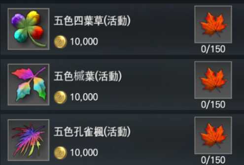 > 五色槭葉(活動)製作公式: 紅色楓葉(活動) 150個 + 10,000金幣