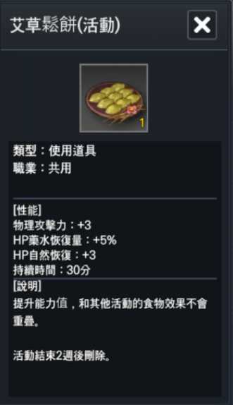 > 艾草鬆餅(活動): 攻擊力 +3, HP藥水恢復量 +5%, HP自然恢復 +3, 持續時間 30分