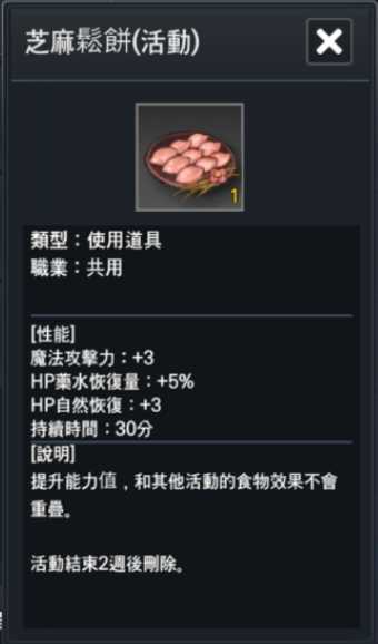 > 芝麻鬆餅(活動): 魔法攻擊力 +3, HP藥水恢復量 +5%, HP自然恢復 +3, 持續時間 30分