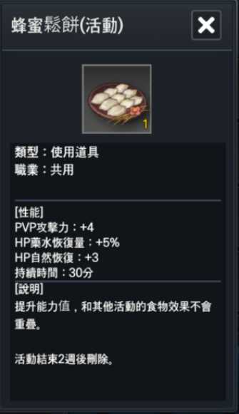 > 蜂蜜鬆餅(活動): PVP攻擊力 +4, HP藥水恢復量 +5%, HP自然恢復 +3, 持續時間 30分
