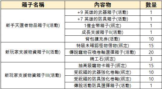b.新玩家支援品箱子I(活動),新玩家支援品箱子II(活動),新玩家支援品箱子III(活動), 成長支援箱子II (所有等級)(活動), 背包擴充券(活動), +9英雄的武器箱子(活動), +7偉大天選者的飾品箱子(活動), +9英雄的武器箱子(活動), +7偉大天選者的飾品箱子(活動)中獲得的活動道具, 傳說寵物召喚卷軸選擇箱子(活動), 傳說寵物召喚卷軸選擇箱子(活動)中獲得的傳說寵物召喚卷軸道具將在活動結束兩週後(預計1月7日)刪除