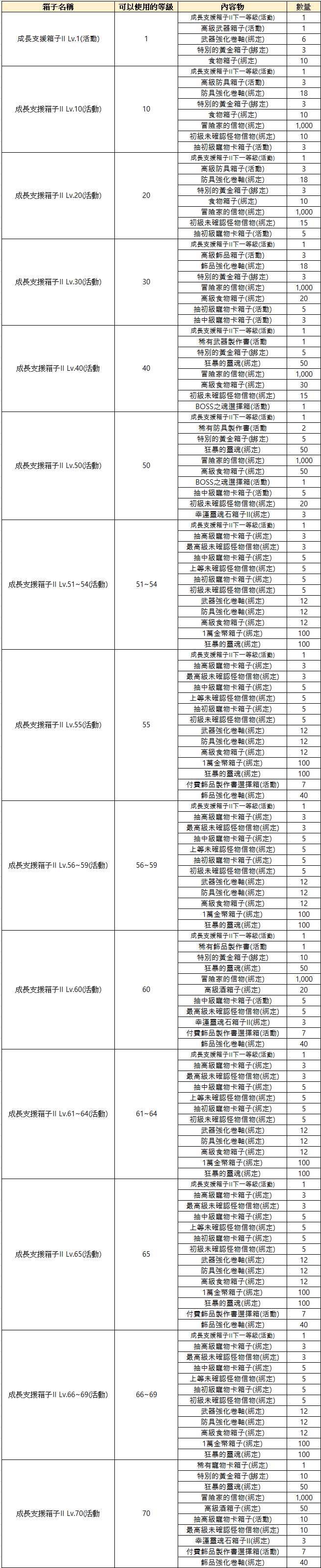 b. 成長支援箱子II(活動) 使用等級與獲得道具目錄