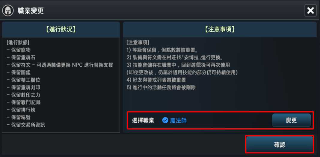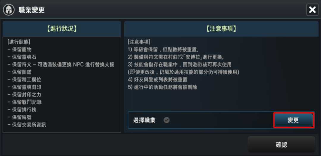 - 若目前職業已習得的技能中,有變更後職業可使用的技能,該技能資訊將會保留。