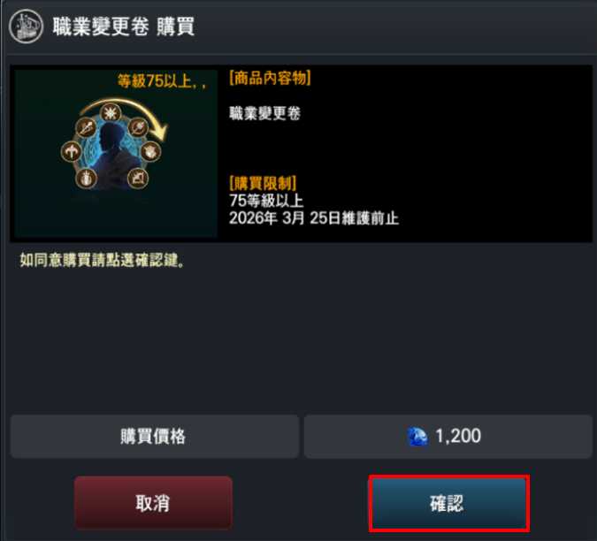 - 職業變更券僅限 75級以上角色,並且需於主城地區方可購買。