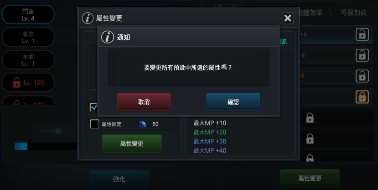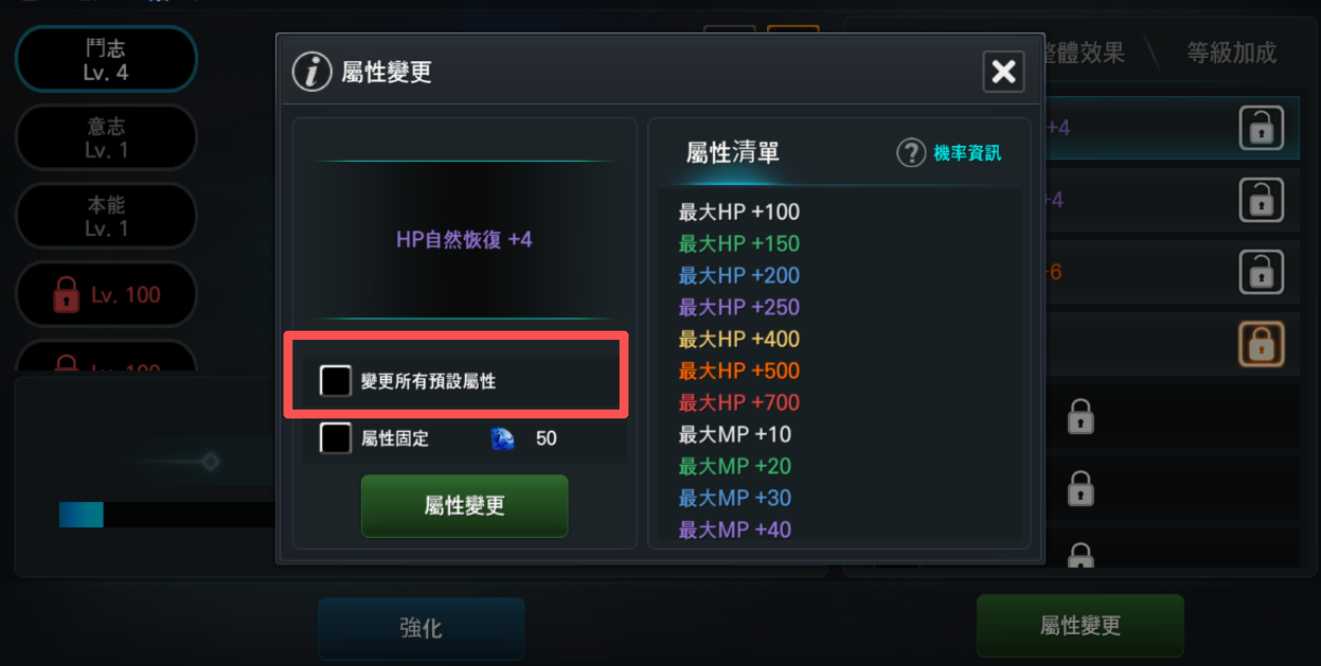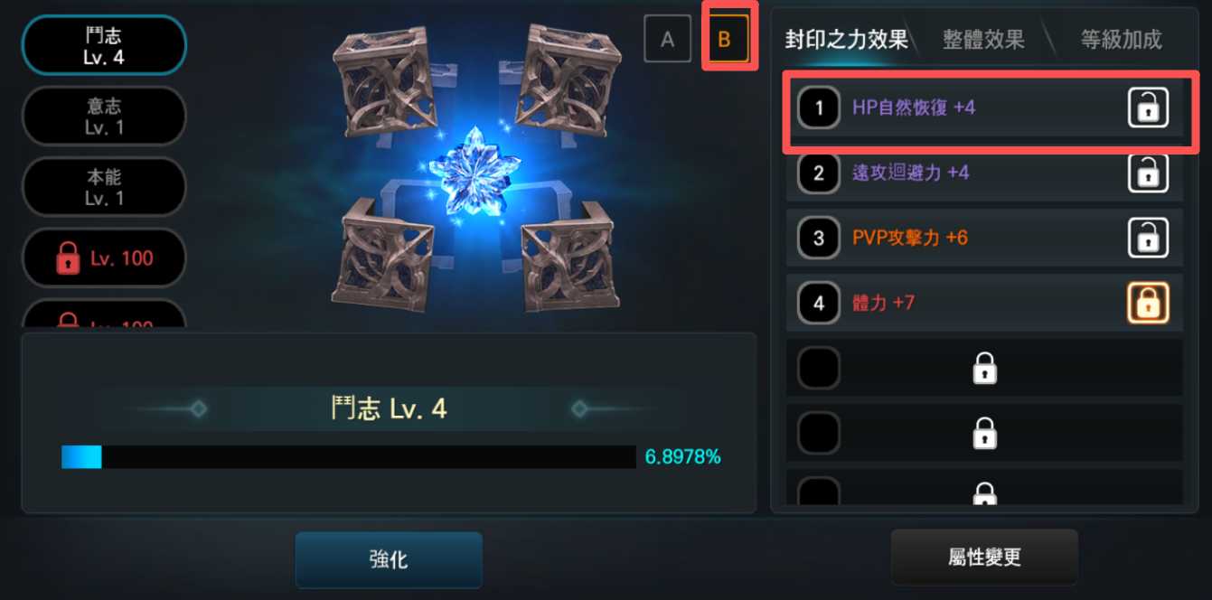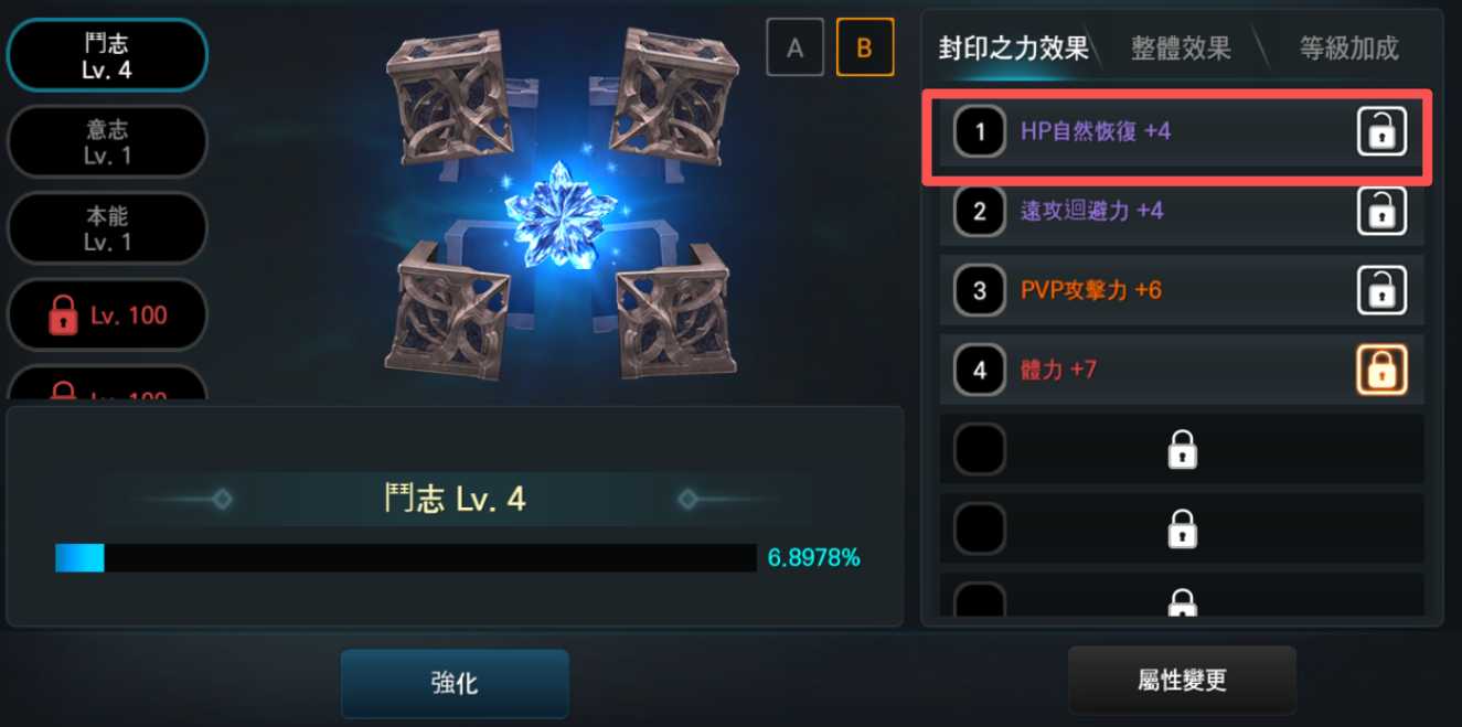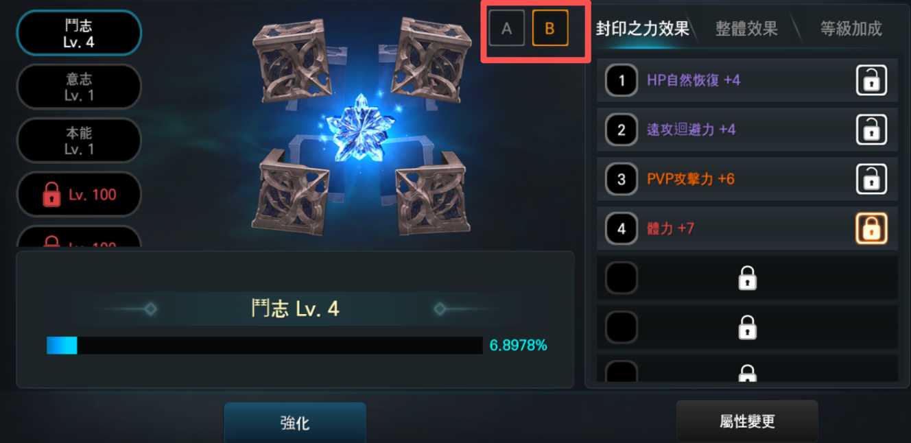 - 封印之力等級升級時,首次獲得的隨機屬性,將相同套用與 A/B 兩組預設中。