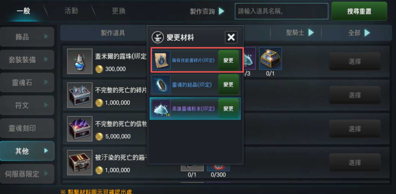 - 新增蓋米爾的露珠(綁定)製作公式中稀有技能書碎片(綁定)的替代材料。