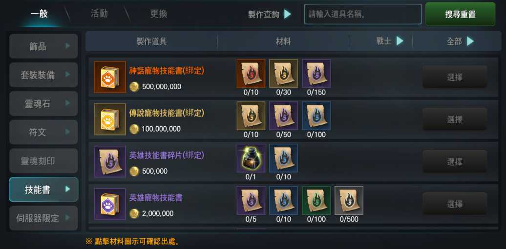 - [製作 > 其他 > 技能書]項目中新增神話寵物技能書製作公式。