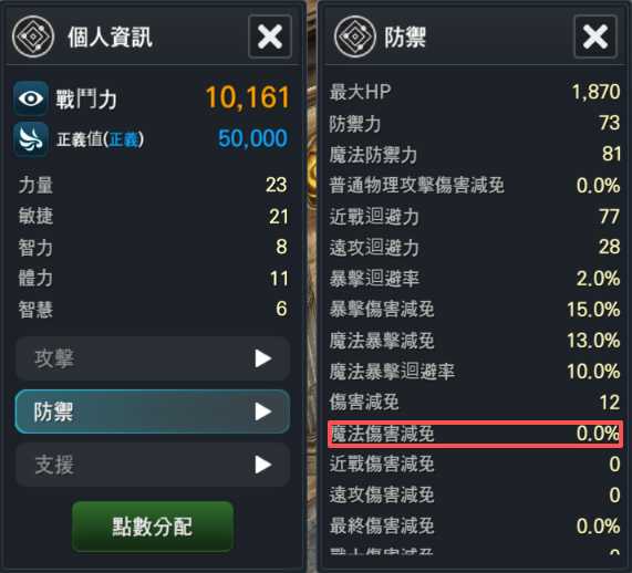 - [個人資訊 > 防禦] 界面新增魔法傷害減免
