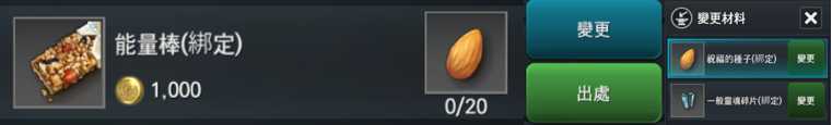 - [製作 > 一般 > 消耗性] 在該項目的能量棒製作公式中,新增替代材料