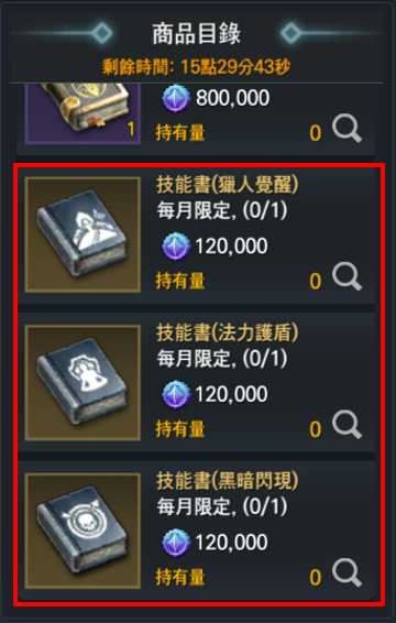 - 可學習期間制技能的技能書,將於血盟等級 30 以上時,每月可於血盟商店購買 1 次。