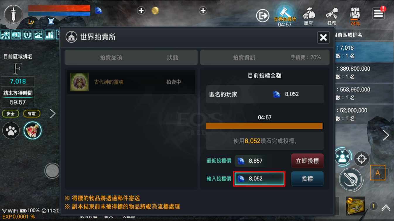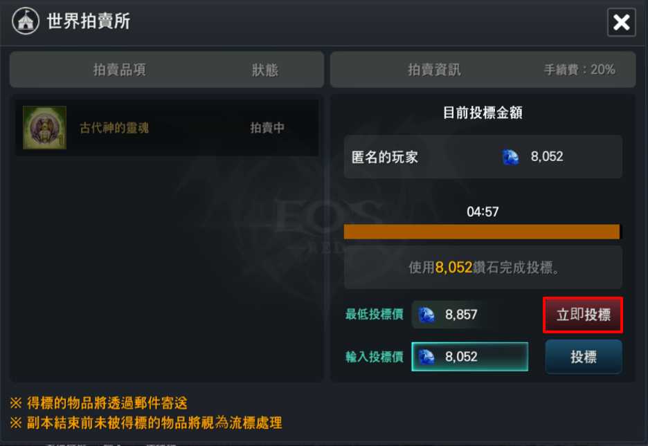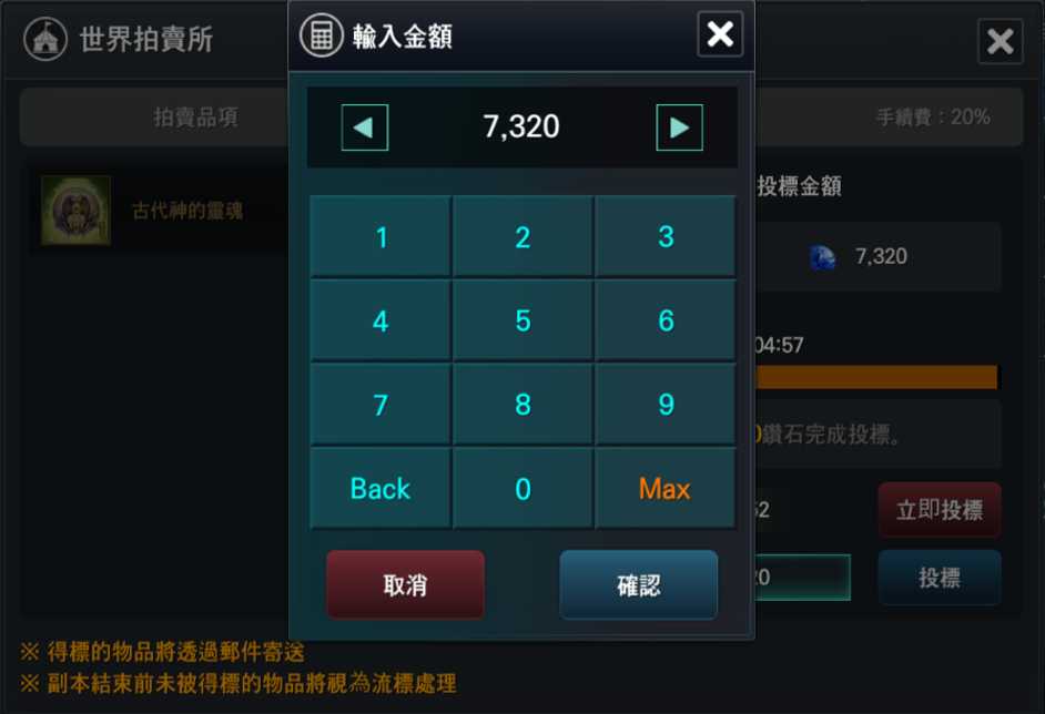 -追加競標的情況下,將依輸入的競標金額額外消耗世界貨幣,並加算至原有的競標金額中。