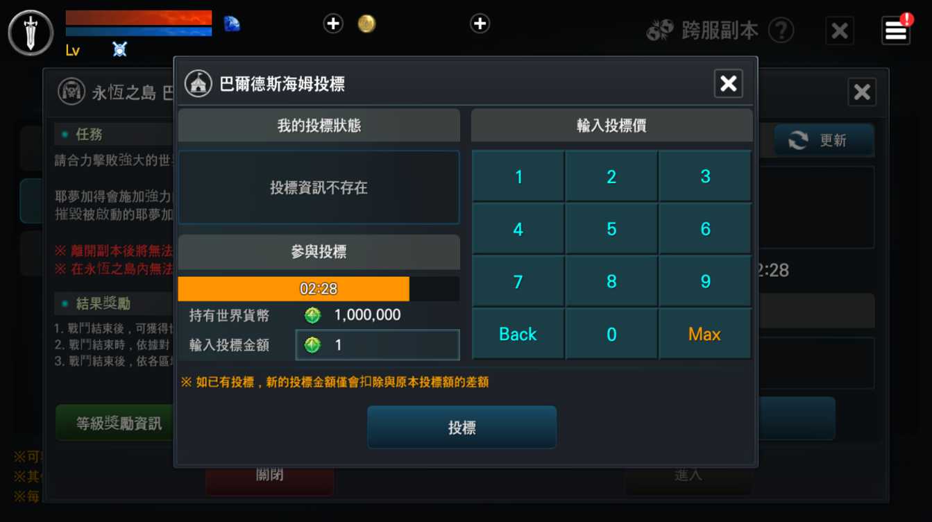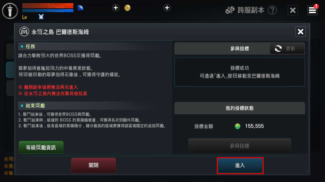 - 於【跨服 > 特殊副本 > 永恆之島 巴爾德斯海姆】點擊【競標】即可參與。